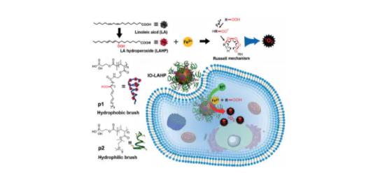 另外金屬離子特別是銅離子、鐵離子會強烈地催化產生自由基。如鐵離子能夠催化形成羥自由基,羥基自由基具有極強的得電子能力,是僅次于氟的氧化劑,幾乎可以和生物體內所有類型的分子發(fā)生反應。例如(見圖1)廈門大學的陳小元教授和聶立銘副教授等人基于鐵氧化物納米粒子(IO NPs)和釋放的鐵(II)之間的亞油酸氫過氧化物(LAHP)的類似Fenton反應,開發(fā)了活性系統(tǒng),藥物釋放的亞鐵離子能夠催化產生自由基殺滅癌細胞。